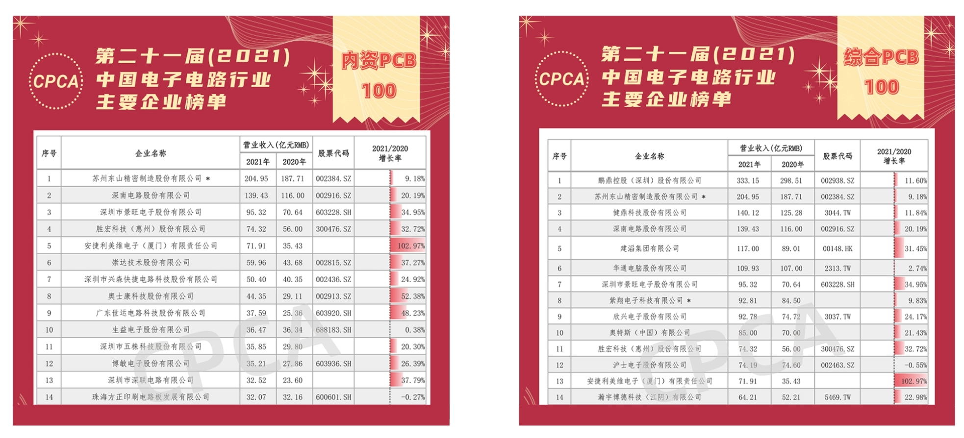 5月18日,由中国电子信息行业联合会和中国电子电路行业协会联合发布的第二十一届(2021)中国电子电路行业主要企业榜单正式发布。榜单中设有综合PCB百强企业排行、内资PCB百强企业排行、覆铜箔板企业排行等10个子榜单,共计有241家企业上榜。其中东升国际官网科技以74.32亿元的营收位居中国综合PCB榜单第11名,内资第4名。