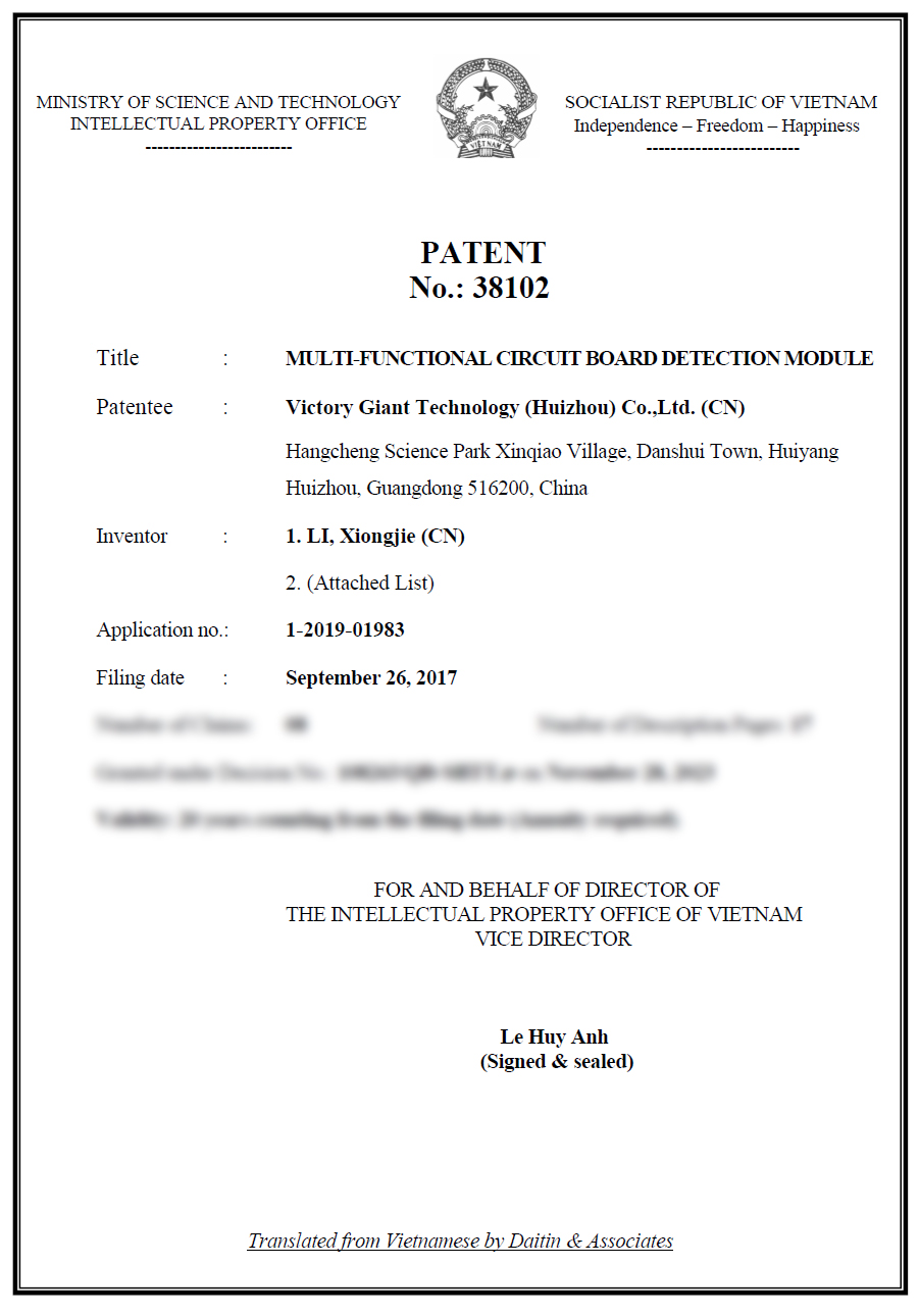 近日,我司两项专利“PCT/CN2017/103329一种多功能线路板检测模块及检测方法” 、“PCT/CN2017/094434一种不同板料混压的高频板制作方法”荣获越南PCT国际发明专利授权。