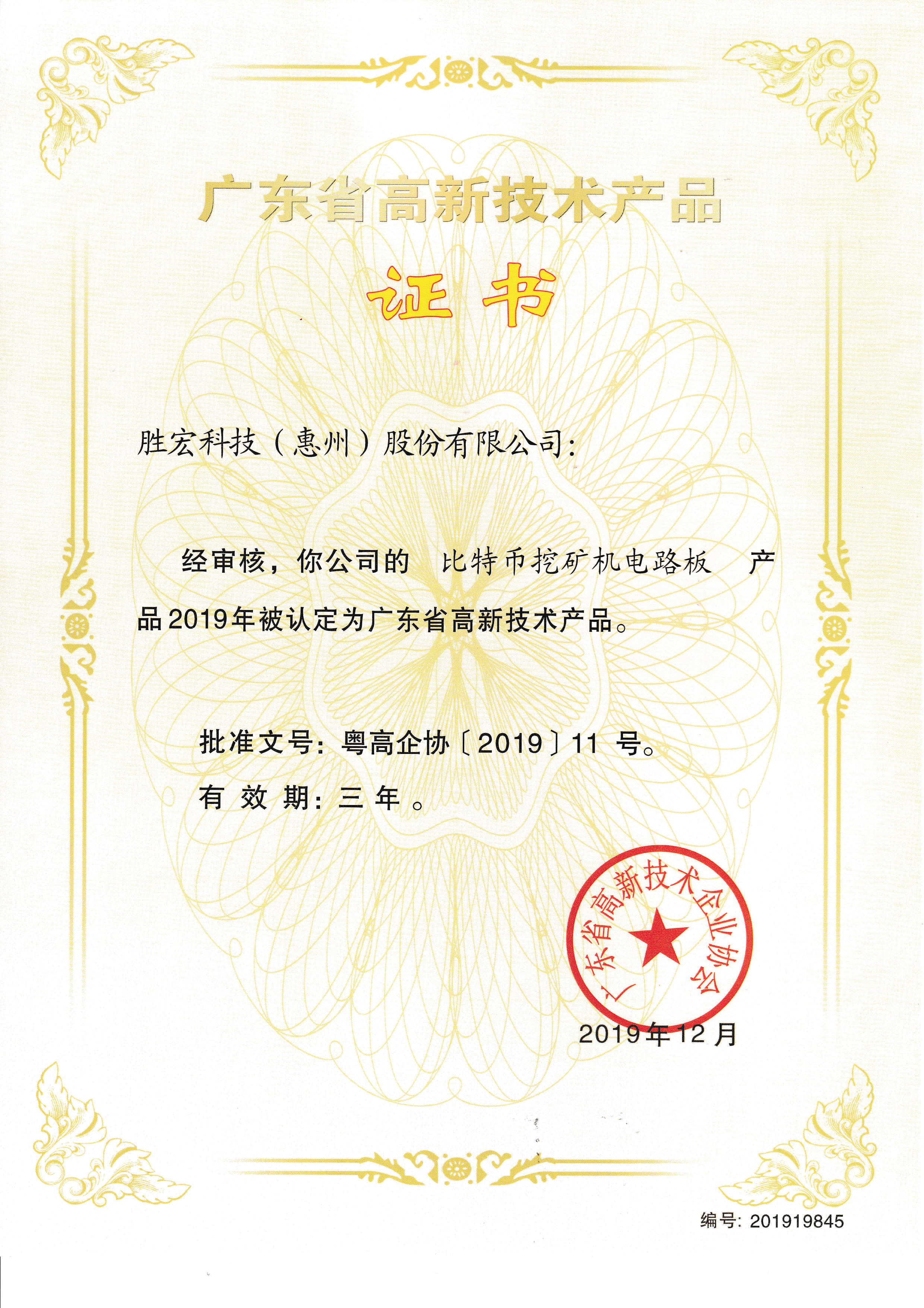 “比特币挖矿机电电路板”高新技术产品证书